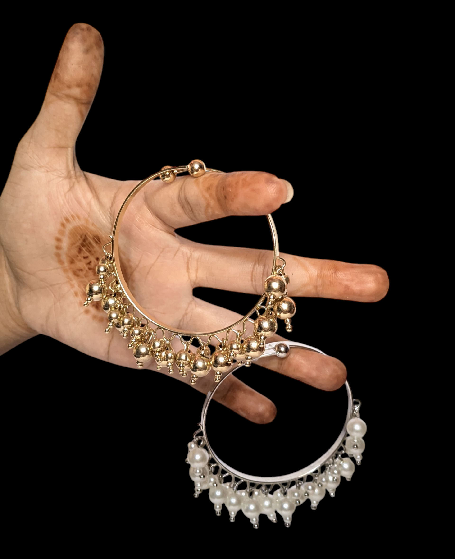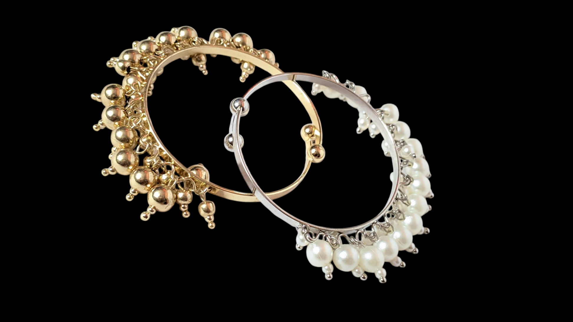 Classic pearls meet golden charm in this beautiful bangle set. With its adjustable size, it offers a perfect fit while enhancing your traditional and contemporary ensembles alike.